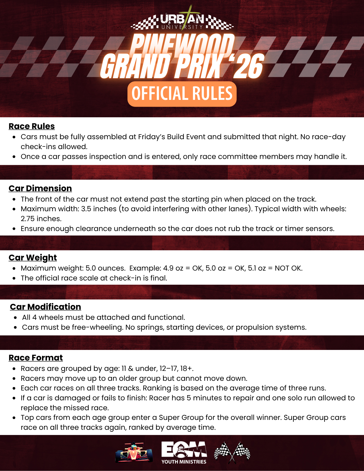 Cars must be fully assembled at Friday’s Build Event and submitted that night. No race-day check-ins allowed. Once a car passes inspection and is entered, only race committee members may handle it.